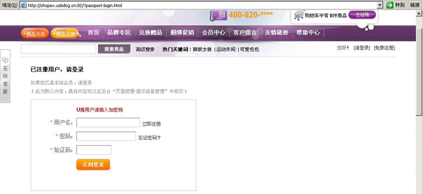 此演示站实现了什么功能? 1. 用户注册后可以登陆此网站,但如果管理员将该用户的权限提升至VIP后,会派发一个加密狗给此VIP用户,派发后,此用户下次登陆时就必须用加密狗才能登陆到网站,否则不能登陆。 2. 对于没有派发加密狗的普通用户依然是可以登陆的,并不影响。 此方案适合于哪些情况? 如果一个网站有普通客户和VIP客户之分,VIP客户是指享受批发价格优惠或者不便公开给普通客户的特殊商品,必须VIP客户才有权限查看,此时用U盾加密狗登陆就非常适合于此种需要,一个VIP客户对应一个加密狗,不可通用,能避免已成为VIP的客户故意泄露给其他人使用。 ShopEx系统的前台首页![]() 点击“请登录”按钮会出现登陆框,在此处U盾用户和非U盾用户均可通过此页面登陆,但U盾用户必须插入加密狗![]() 当插入加密狗后,会自动显示此加密狗所对应的用户名。![]() 只须输入密码即可登录![]() 登录后的状态如下![]() 如果在登录成功后,拔出加密狗,那么会出现提示“要求拔出U盾加密狗”。![]() 在没有插入加密狗的情况下,如果用已派发加密狗的用户名来登录,那么会提示“您是U盾用户,请插入加密狗”![]() 如果使用没有派发加密狗的用户登陆,那么不会出现“必须插入加密狗”的提示![]() 非加密狗用户登陆后状态如下![]() |